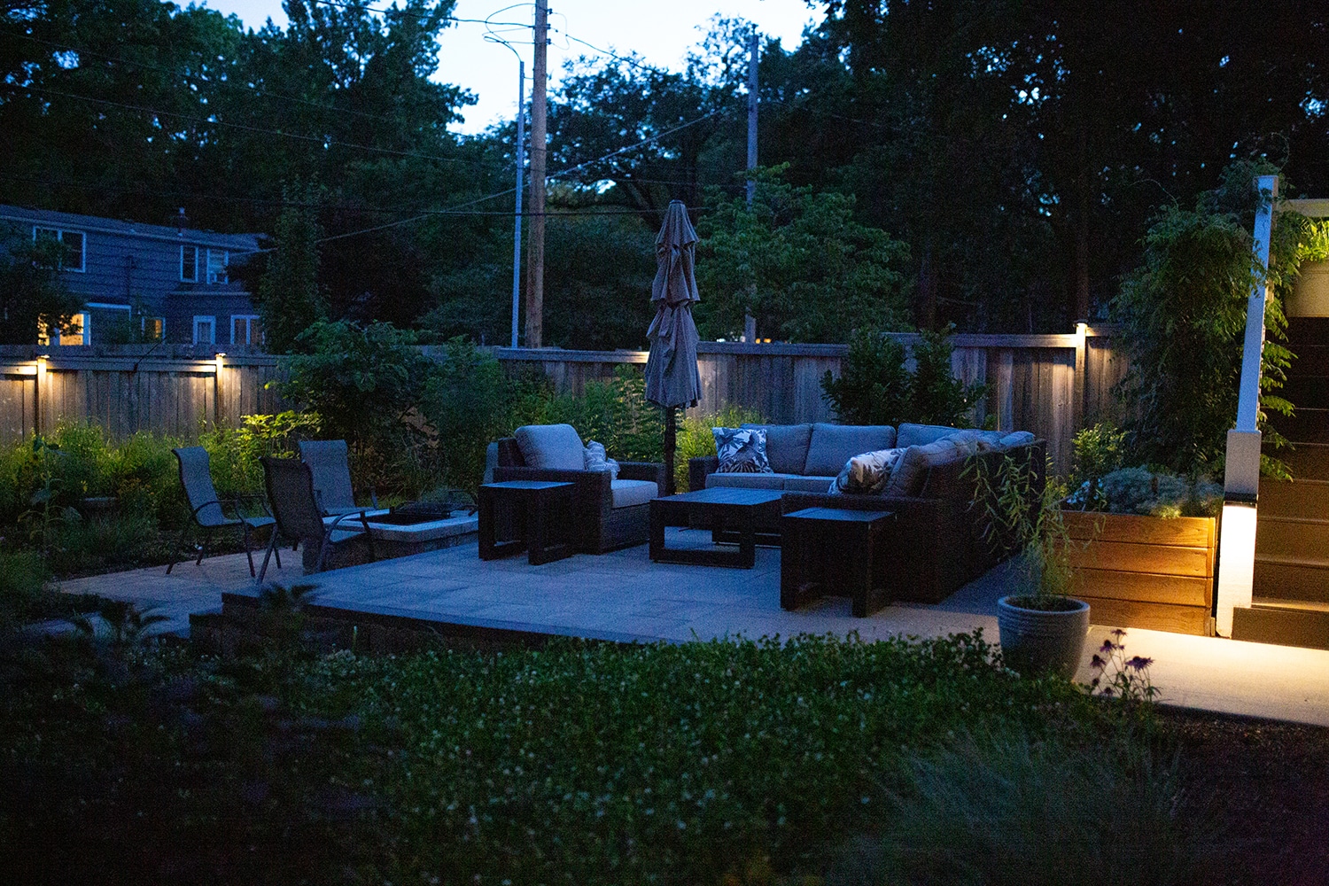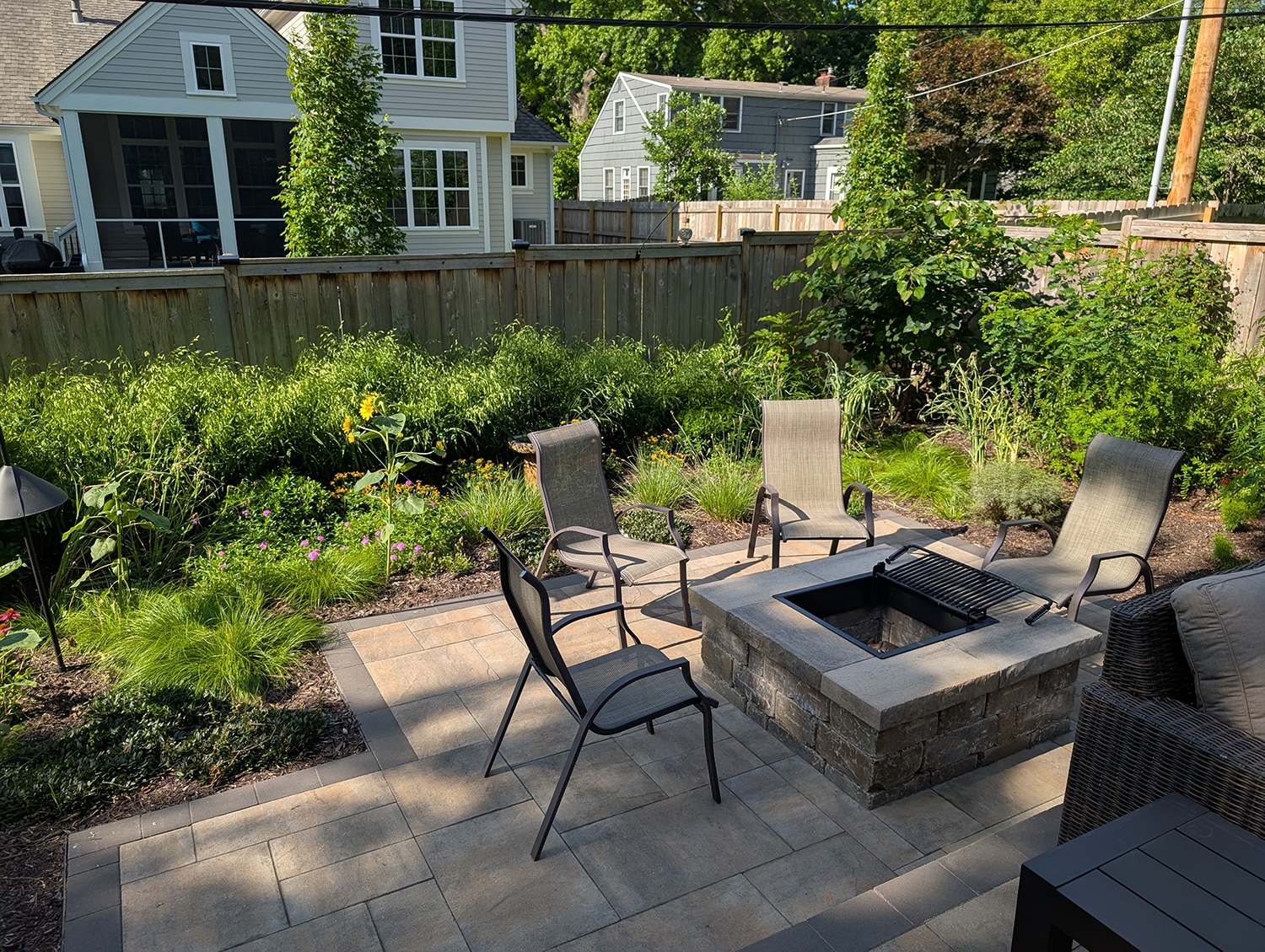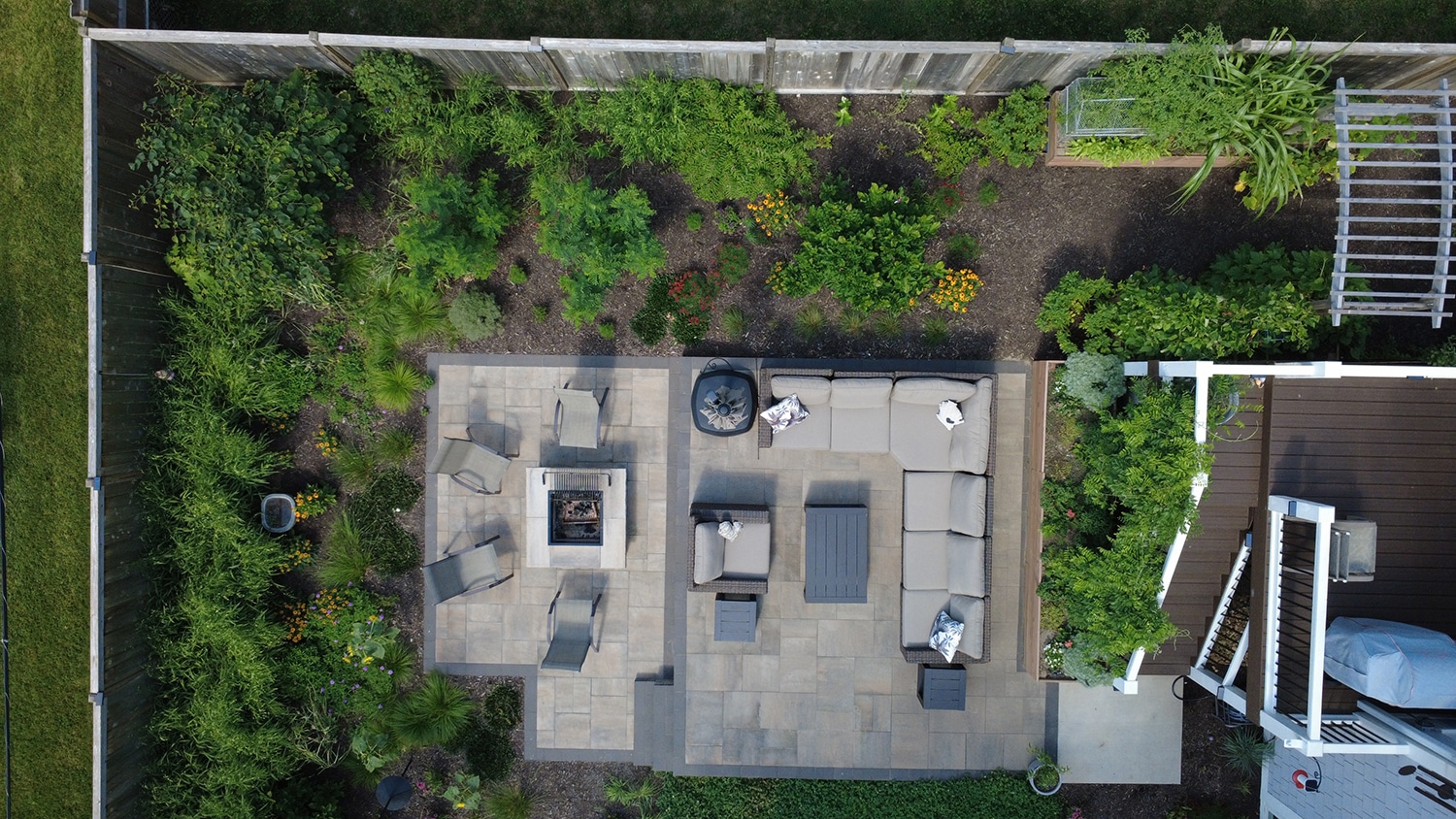 Raised planter beds on either side with a wood arbor create the perfect entry into the backyard where you see the two-tiered patio. The upper tier patio serves as a place to sit down and relax while enjoying the garden areas. The lower tier has a fire pit where the edge of the upper tier serves as seating for the fire pit. A clover lawn in the center of the yard provides a doggy relief area while being a no mow lawn solution.