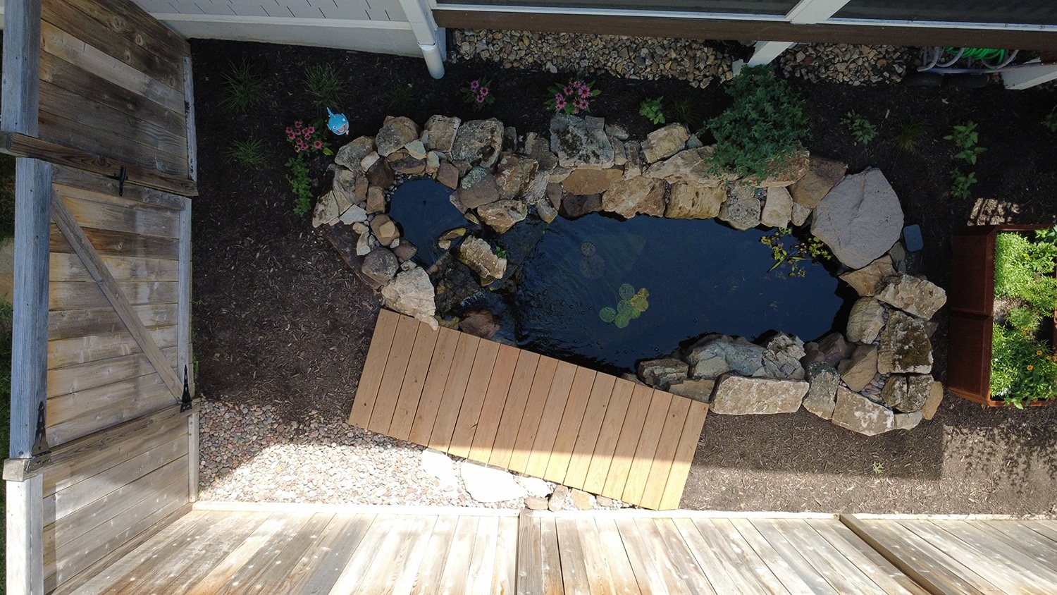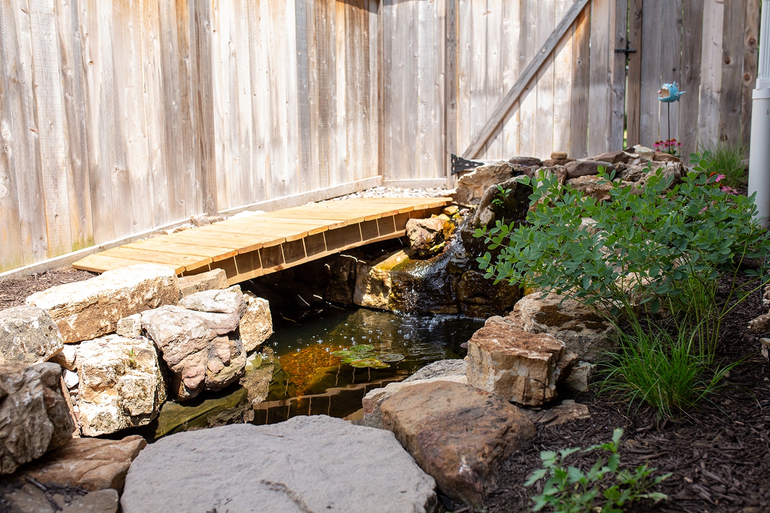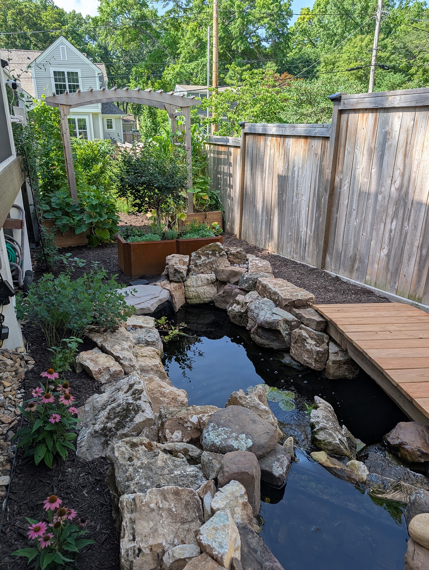 When you enter into the backyard, you are immediately greeted with the pond. To get further into the space, you will have to travel over a wood bridge. This pond doesn’t just look nice; it serves as a stormwater management feature. Before the pond, the downspouts on the western half of the house would wash away the mulch and cause erosion on the side yard. The pond has 1.5 feet of free board to absorb stormwater before it overflows. The pond also is over 3 feet deep to be able to support fish year round.