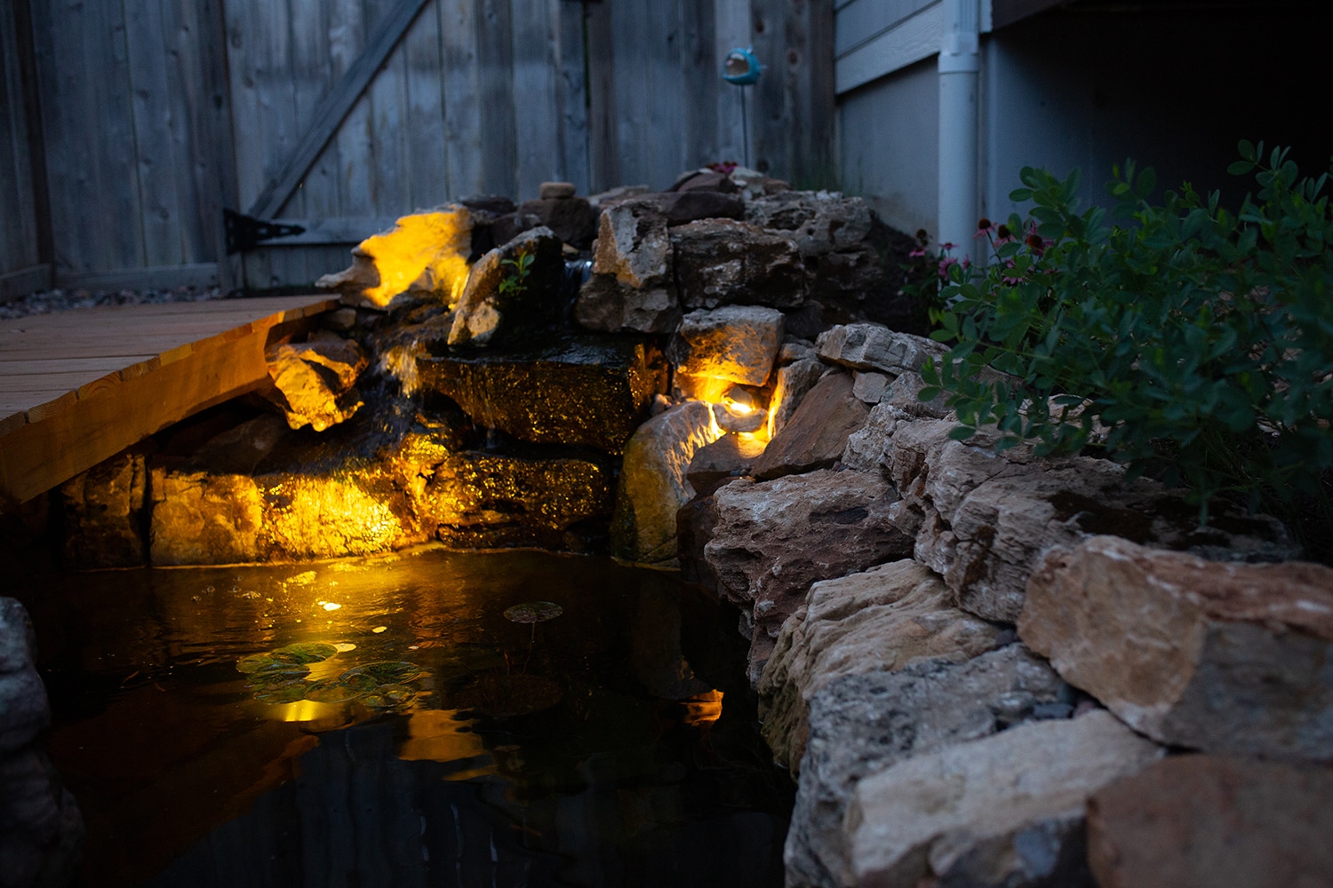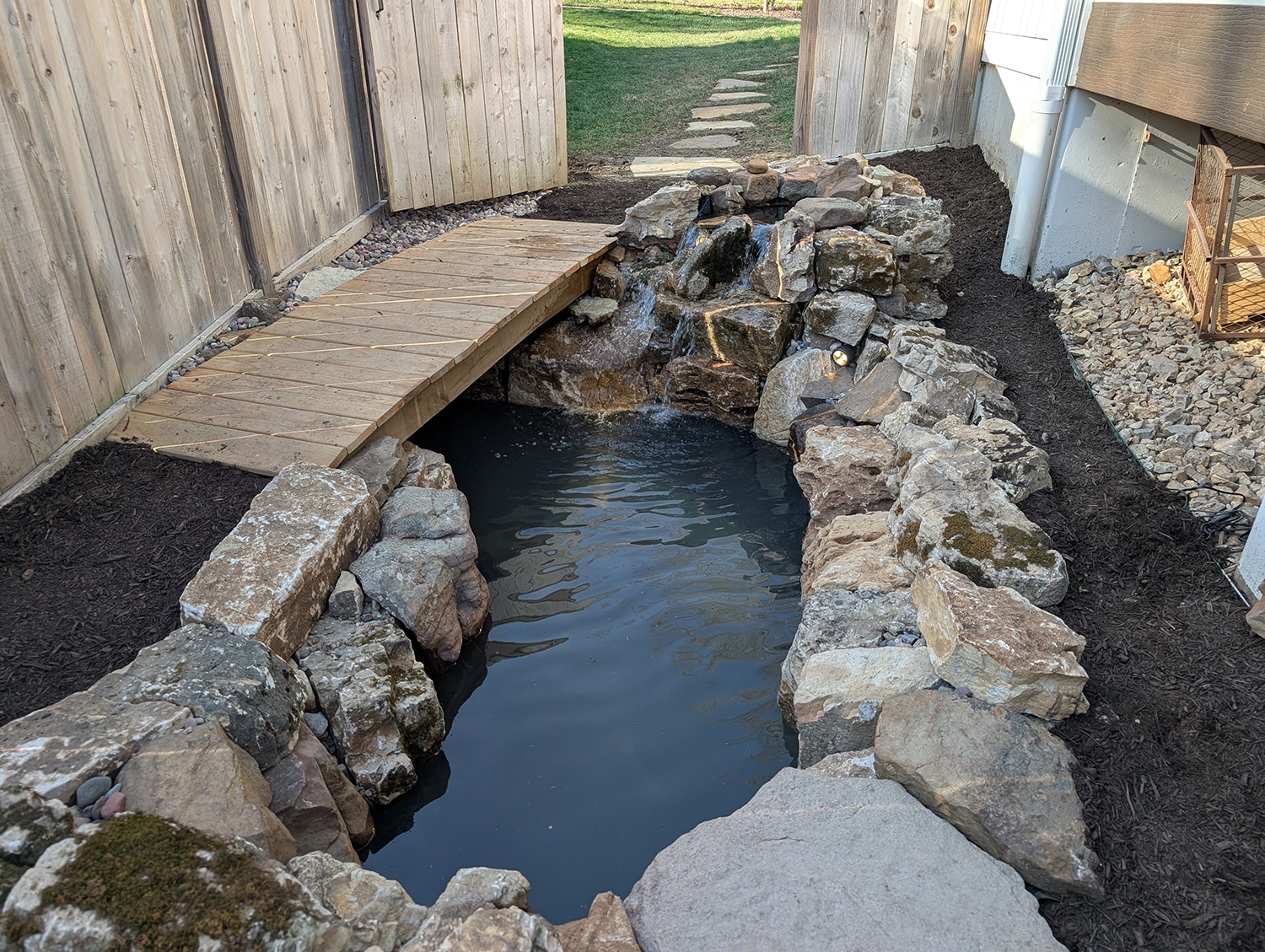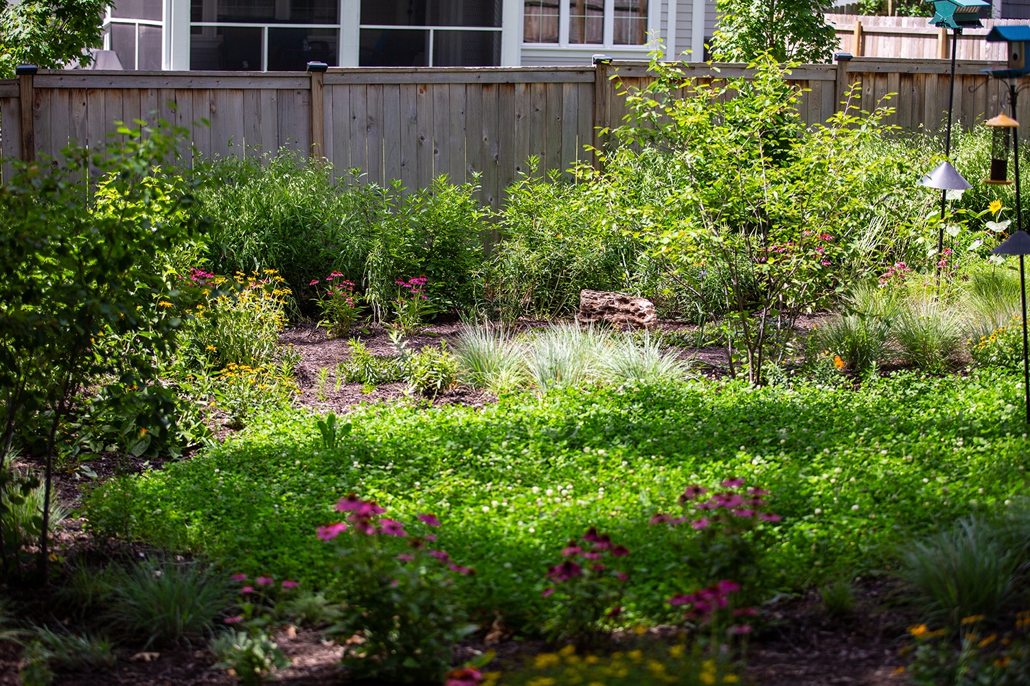 When you enter into the backyard, you are immediately greeted with the pond. To get further into the space, you will have to travel over a wood bridge. This pond doesn’t just look nice; it serves as a stormwater management feature. Before the pond, the downspouts on the western half of the house would wash away the mulch and cause erosion on the side yard. The pond has 1.5 feet of free board to absorb stormwater before it overflows. The pond also is over 3 feet deep to be able to support fish year round.