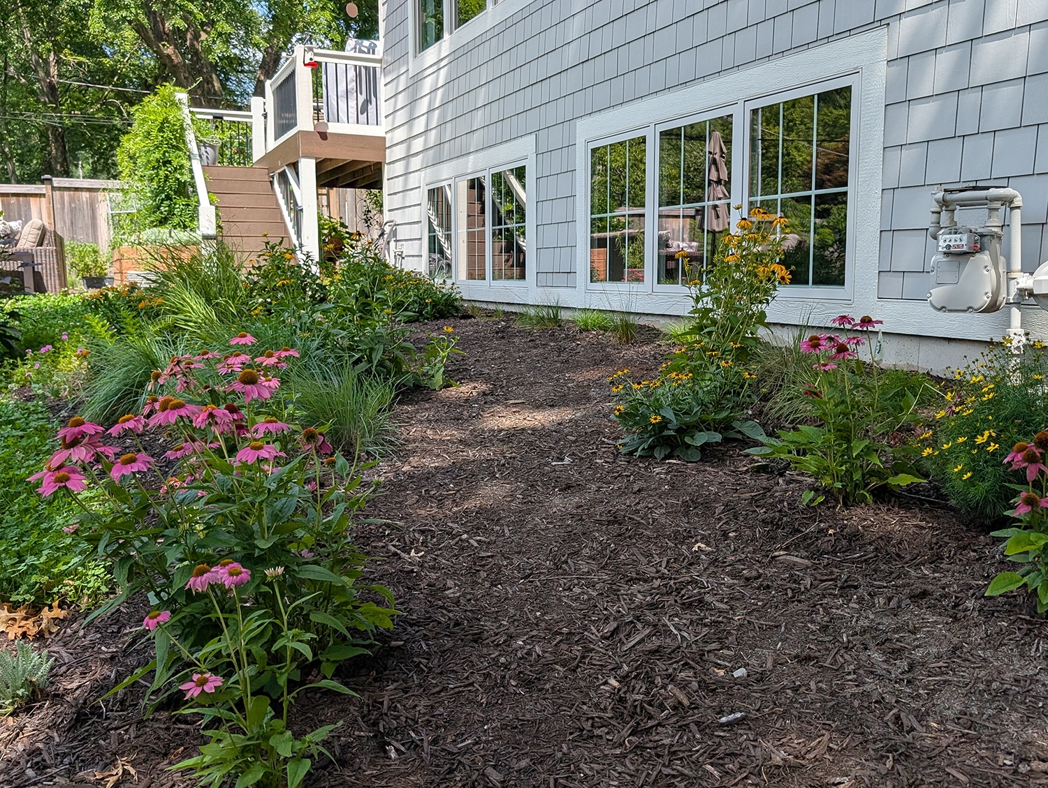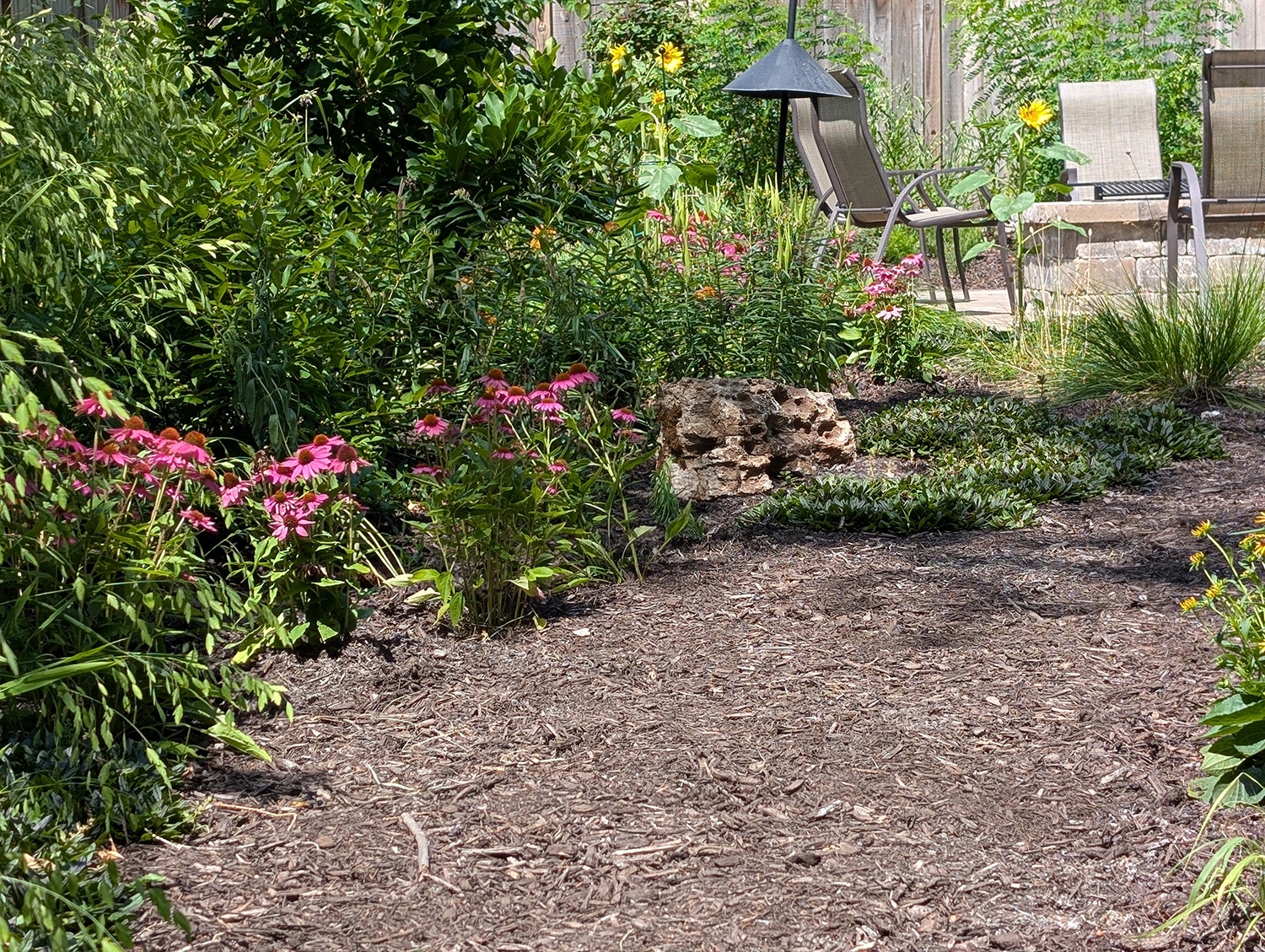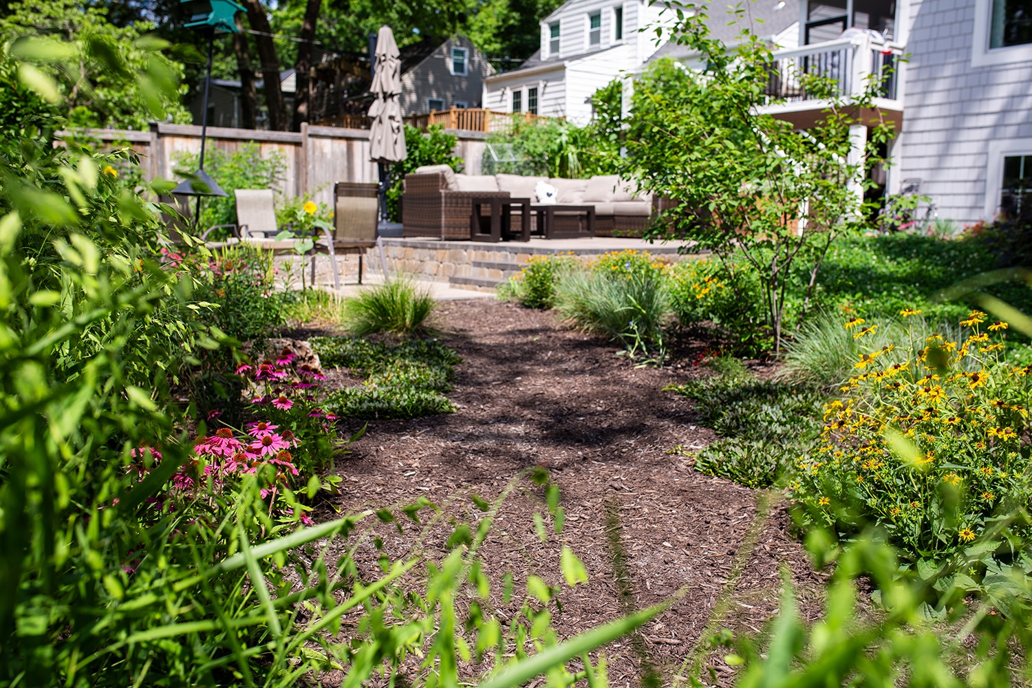 The rest of the yard is filled with native plants and shrubs that have a mulched path running through it. Along the path intentionally placed shrubs provide dimension and interest that draw you into the space while creating several small “rooms”.