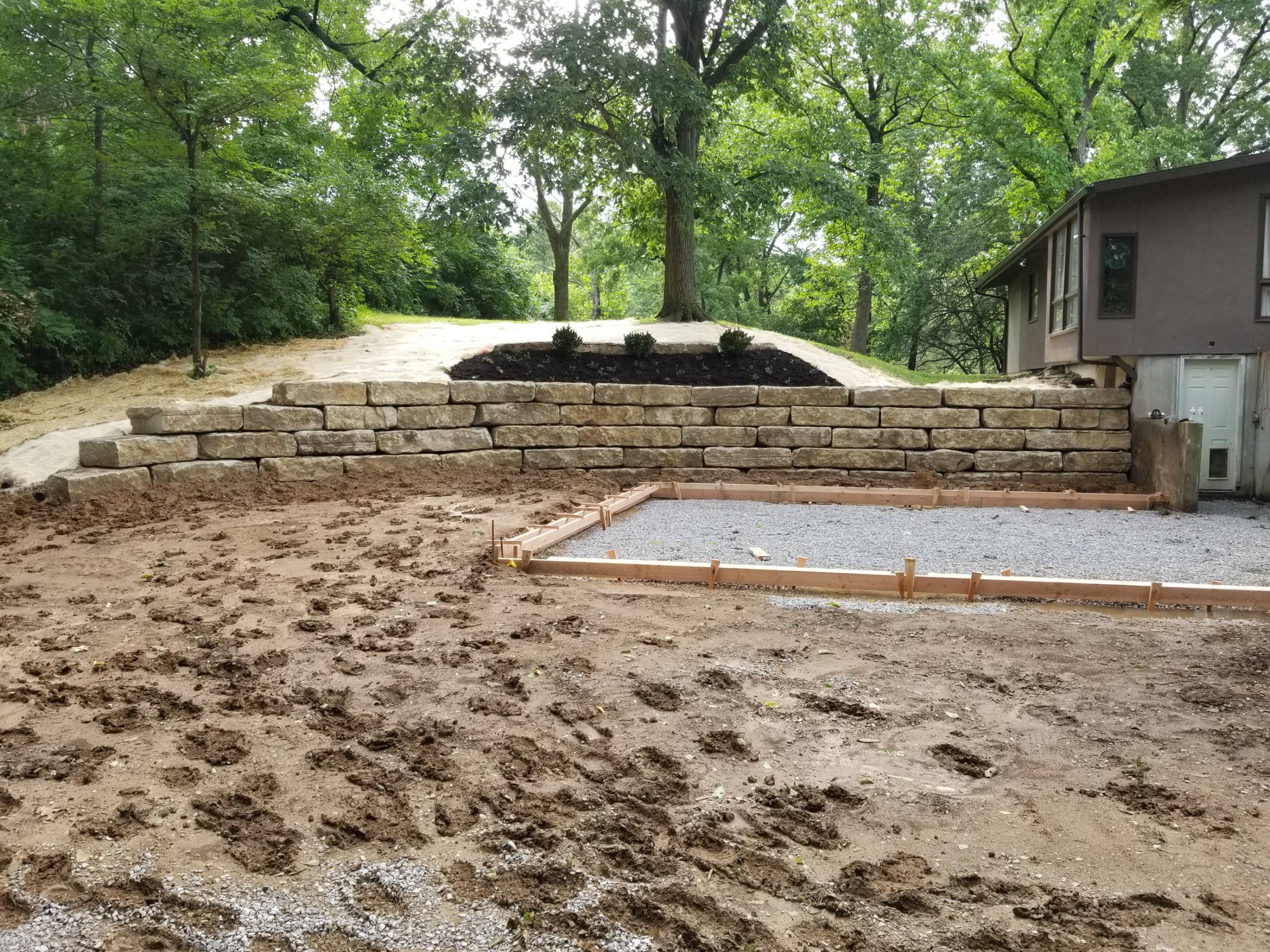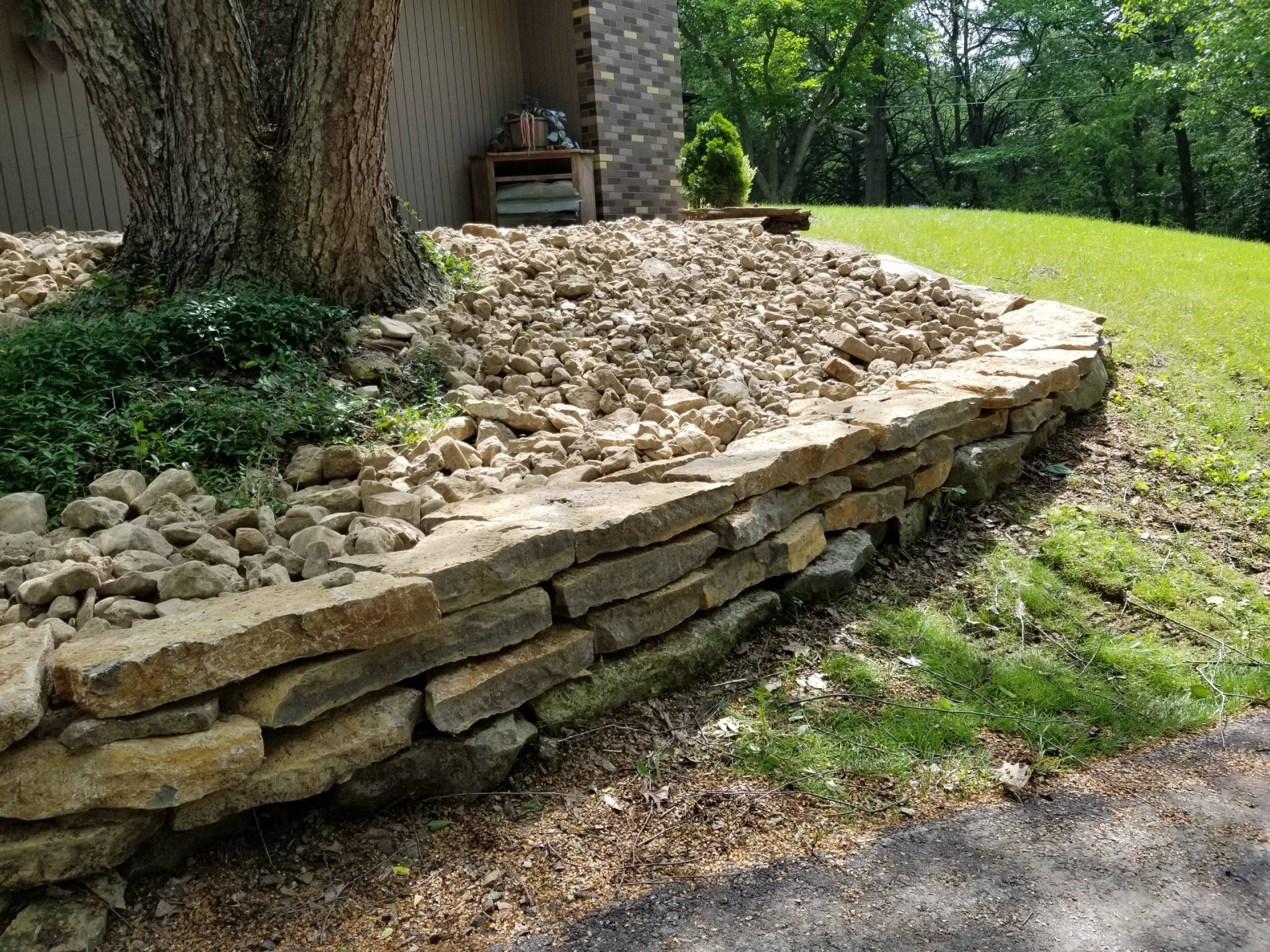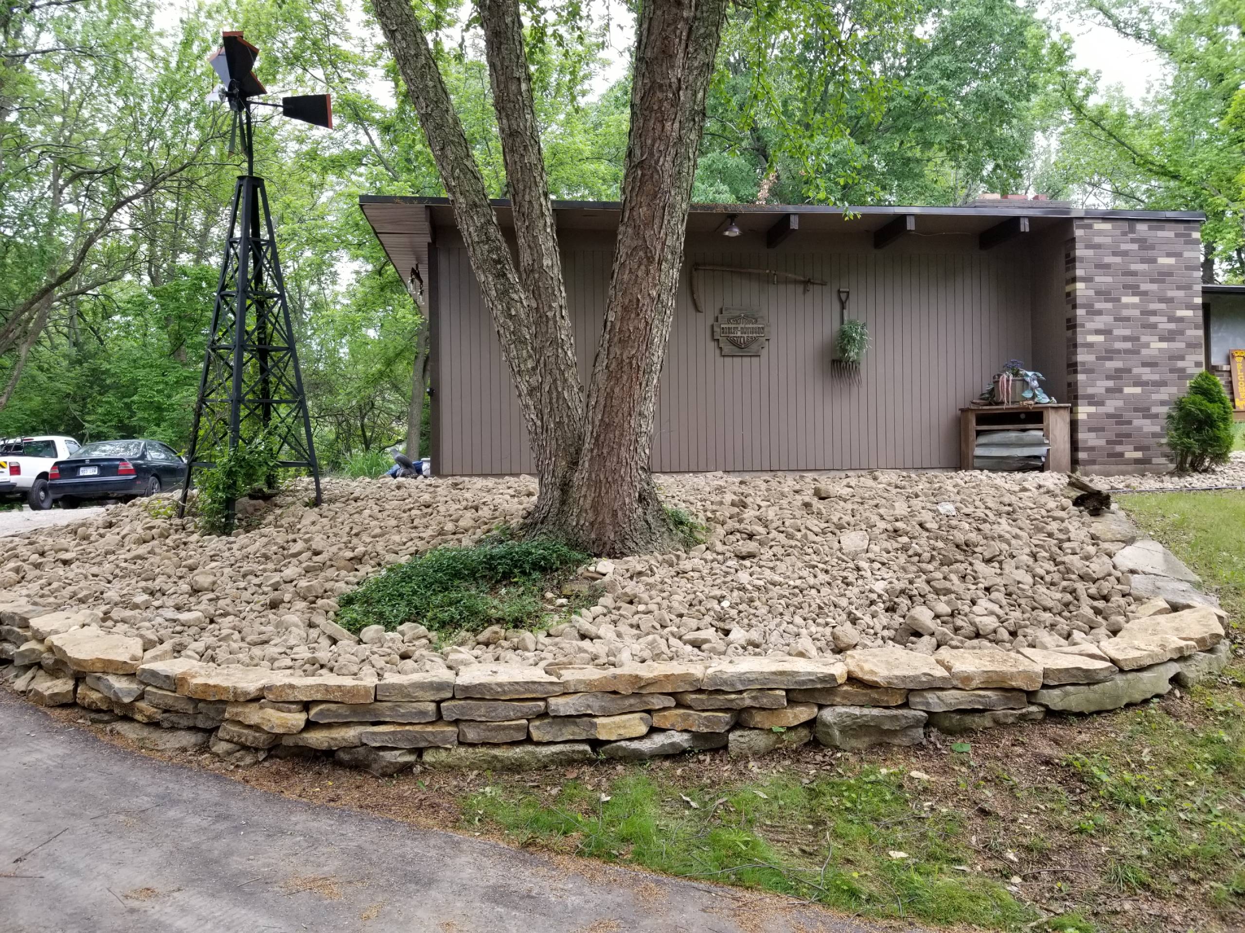 This homeowner is fixing up his property and wanted a landscape that would allow him to have lower maintenance and more usable space. The solution was removing the mulch in the planting beds and replace with native river rock. The decorative rock mulch will now stay in place and not wash away in the storms. A small dry-stacked wall was built to help hold the new decorative rock in place. In the backyard, a new limestone block retaining wall was created to allow the homeowner to build a new detached garage. Addition of drainage pipes and redirecting downspouts will help direct stormwater away from the house and the new stone wall.