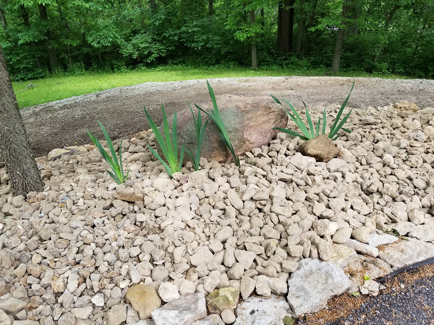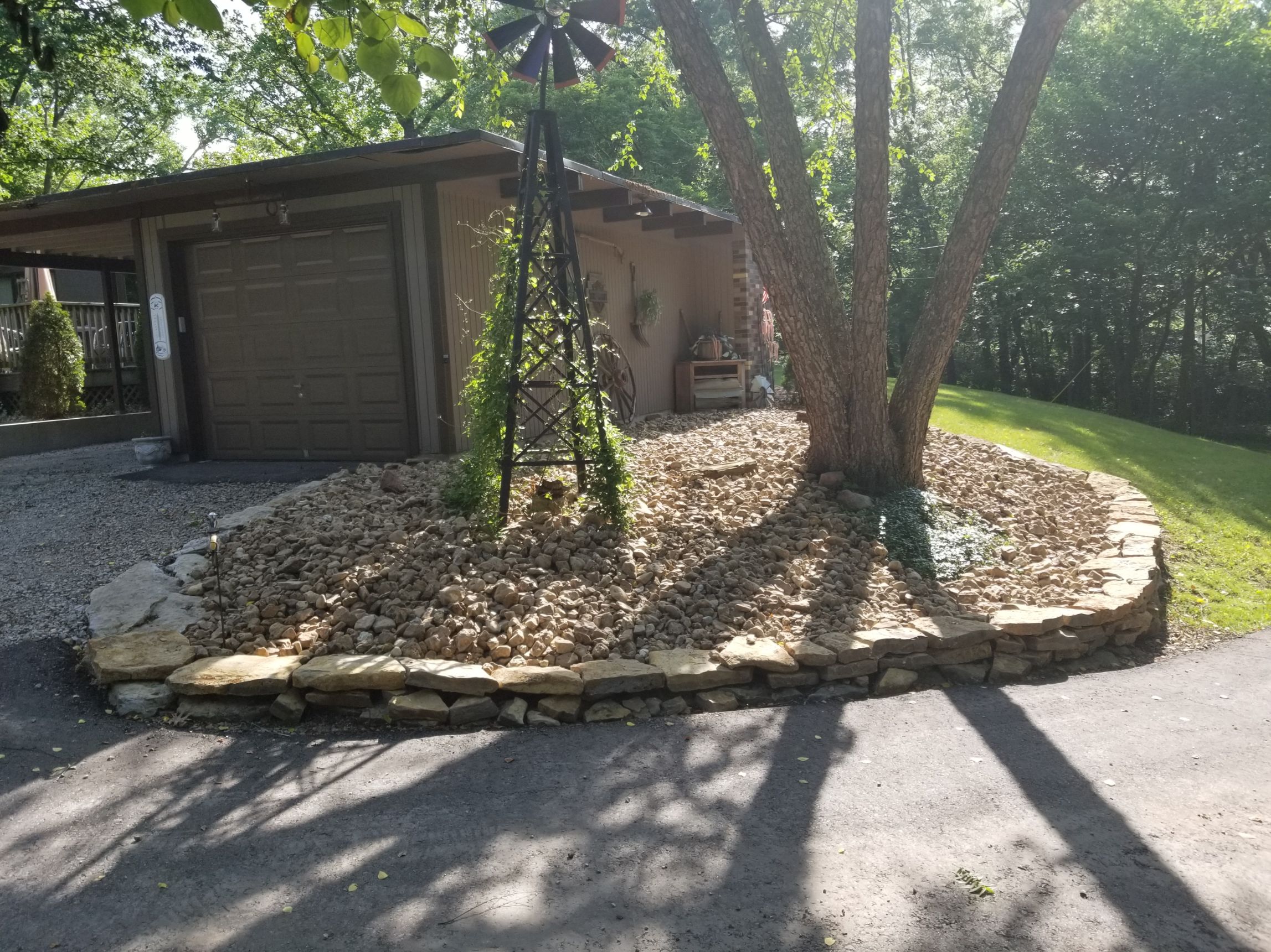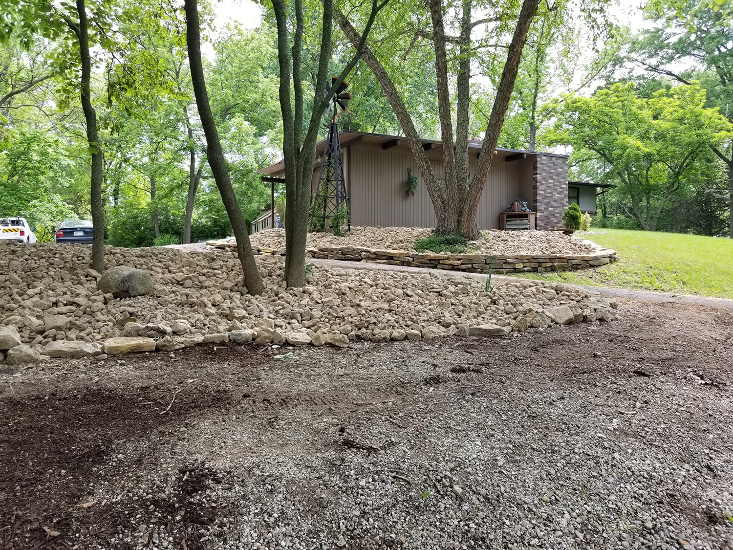 This homeowner is fixing up his property and wanted a landscape that would allow him to have lower maintenance and more usable space. The solution was removing the mulch in the planting beds and replace with native river rock. The decorative rock mulch will now stay in place and not wash away in the storms. A small dry-stacked wall was built to help hold the new decorative rock in place. In the backyard, a new limestone block retaining wall was created to allow the homeowner to build a new detached garage. Addition of drainage pipes and redirecting downspouts will help direct stormwater away from the house and the new stone wall.