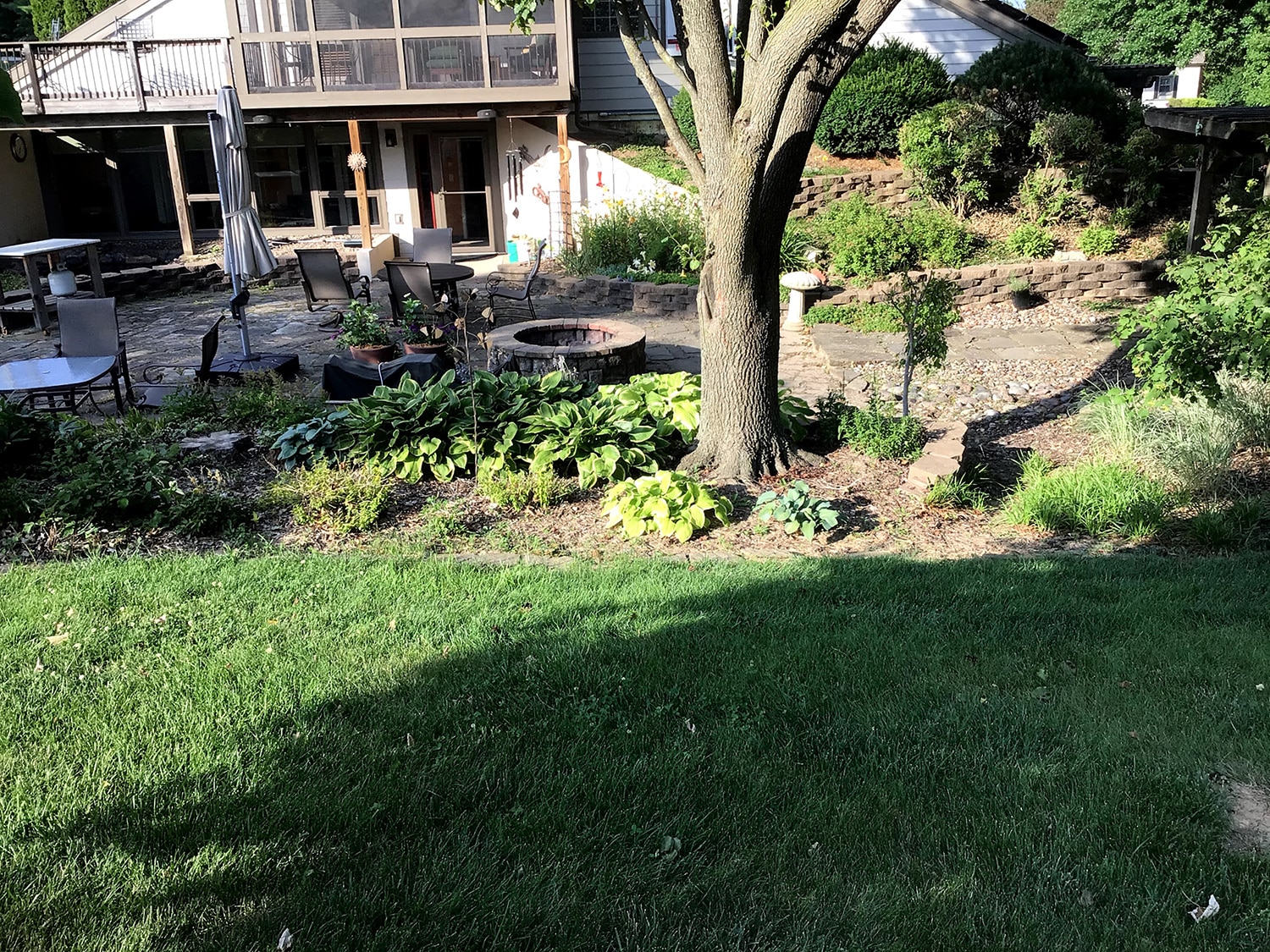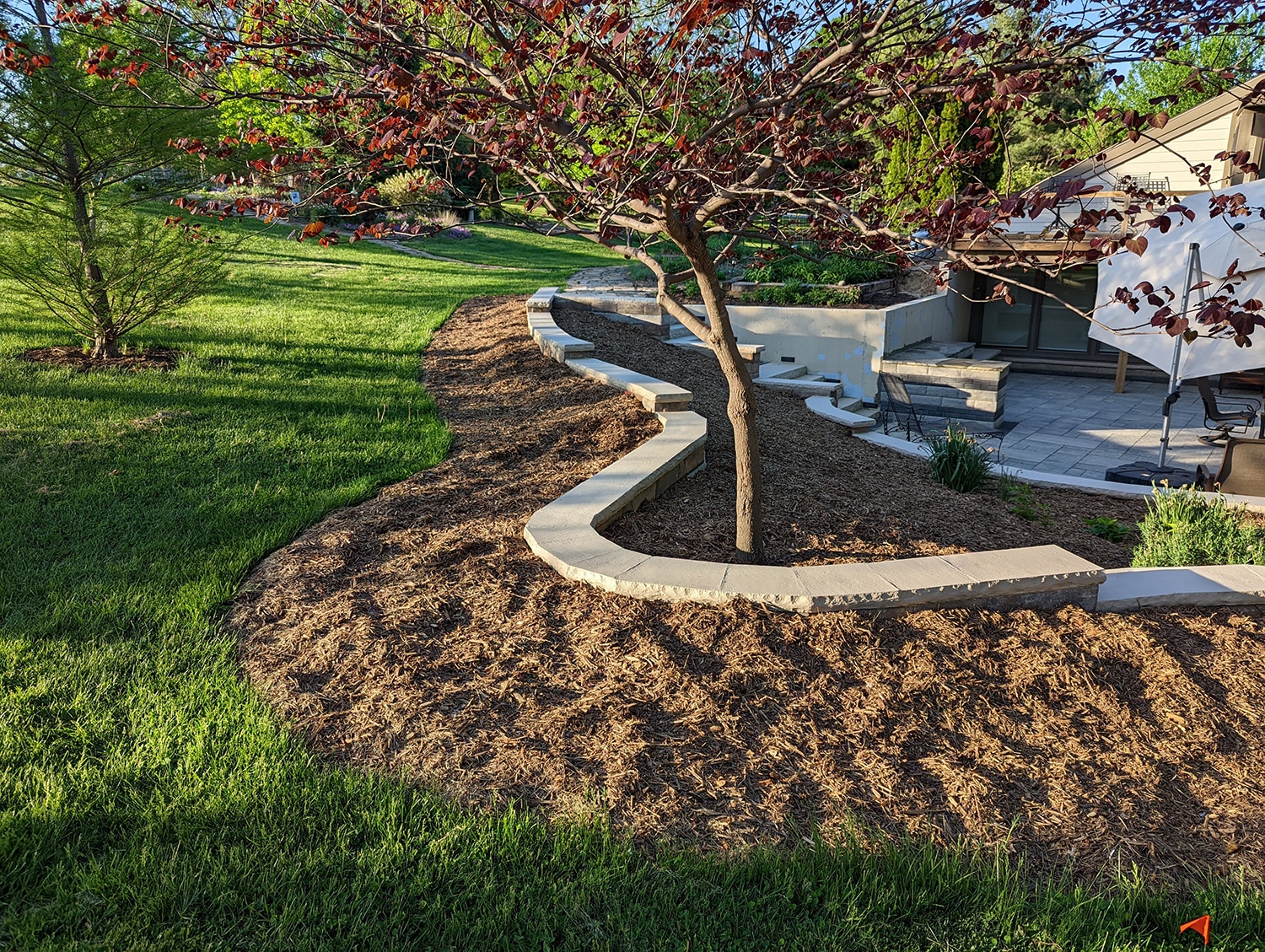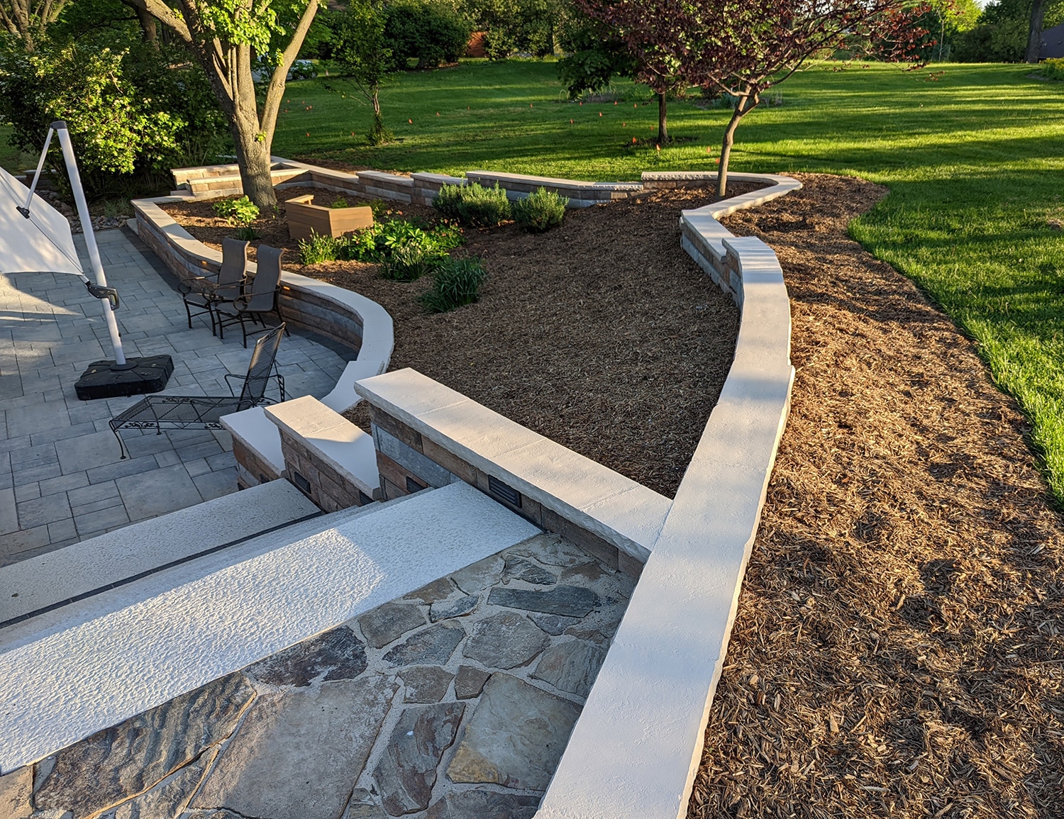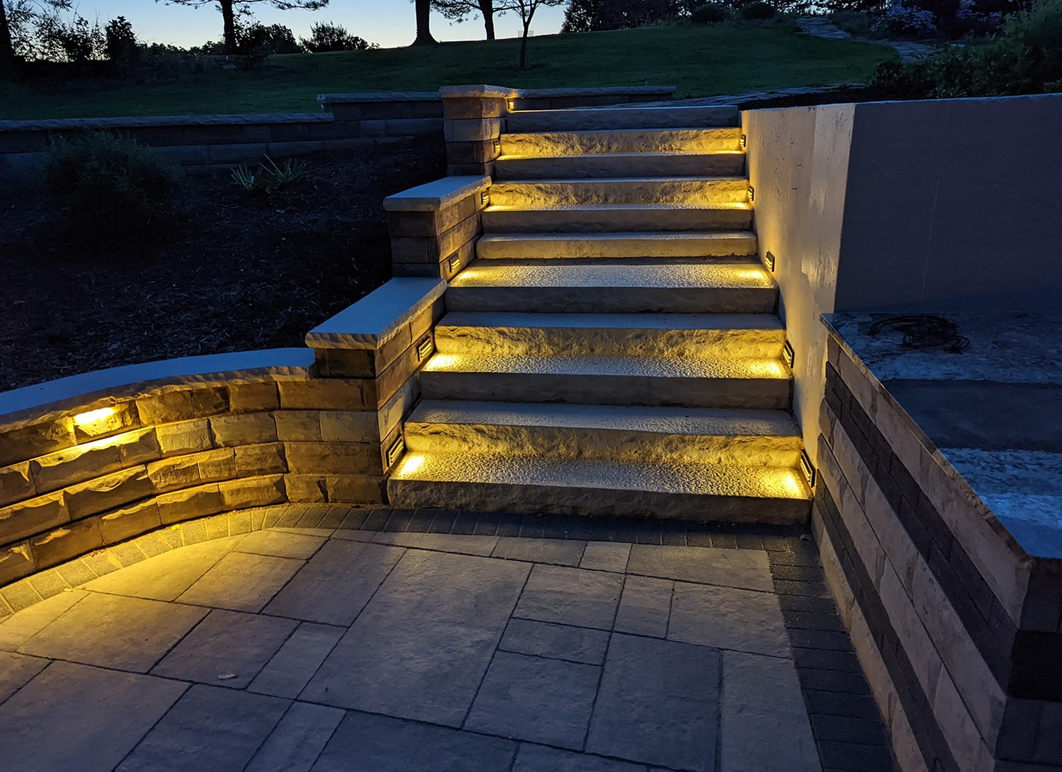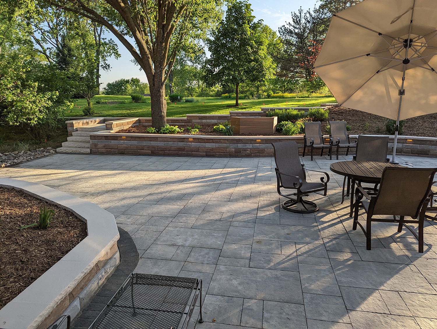This project was no small job. We replaced over 600 square feet of existing retaining walls and added just over 300 square feet of new retaining wall that encircles the patio space and garden beds. We also added two sets of stone steps and replaced over 1300 square feet of paver patio. The finishing touch was new outdoor lighting that provides the right amount of ambient light to safely enjoy the space at night.