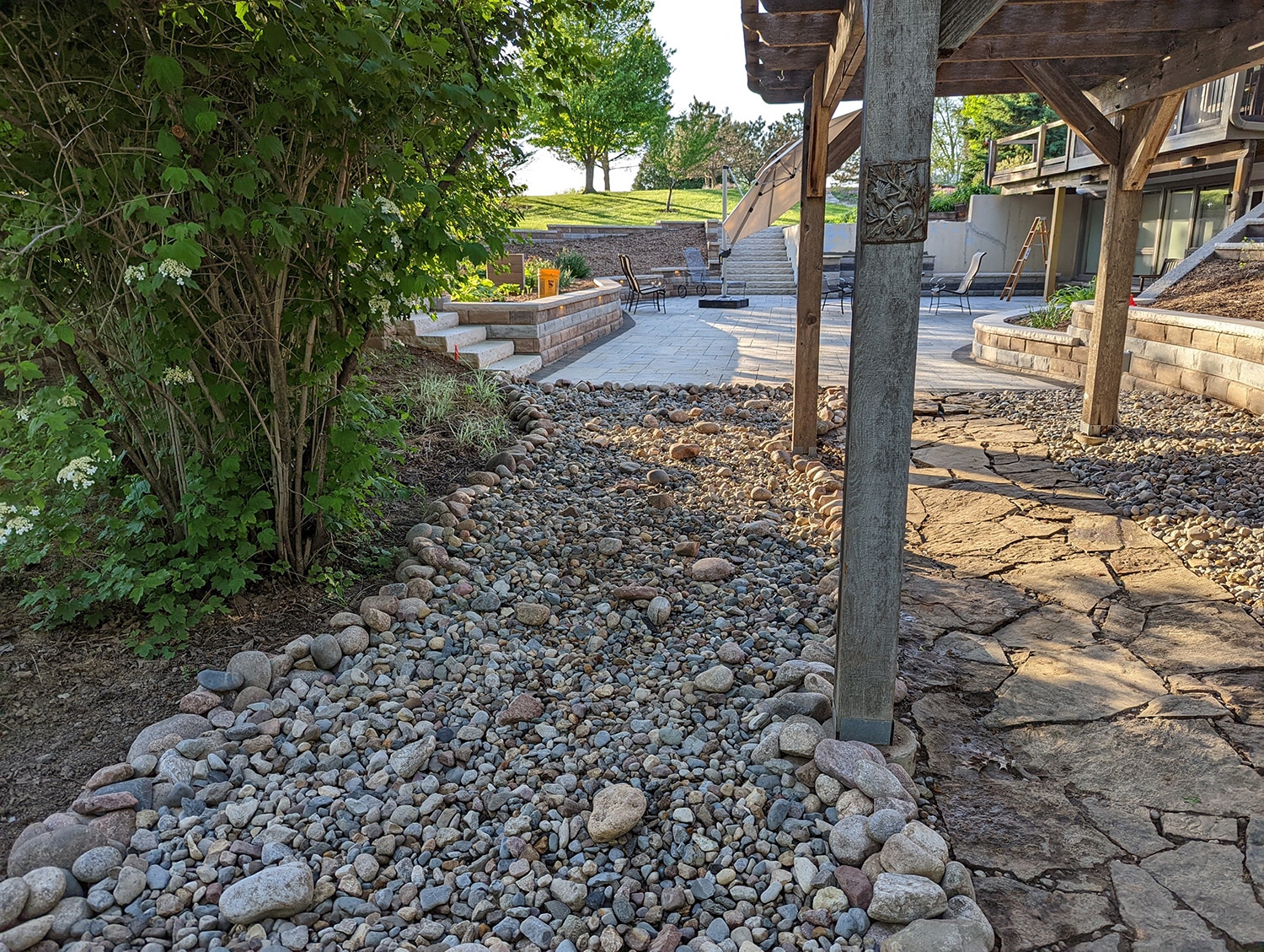 Due to a high-water table that was discovered in the excavation phase, a network of french drains and drainage pipes run underneath the patio, directing water from saturated areas into a new infiltration trench that is located underneath the restored dry creek bed. The infiltration trench has a capacity of storing a 2” rainstorm in 24 hours (130 cubic feet) and it is designed to overflow into the homeowner’s existing rain garden.