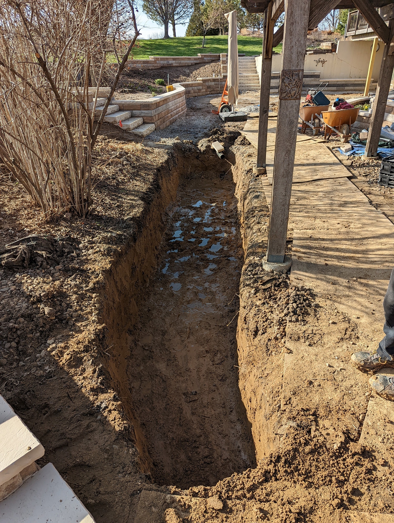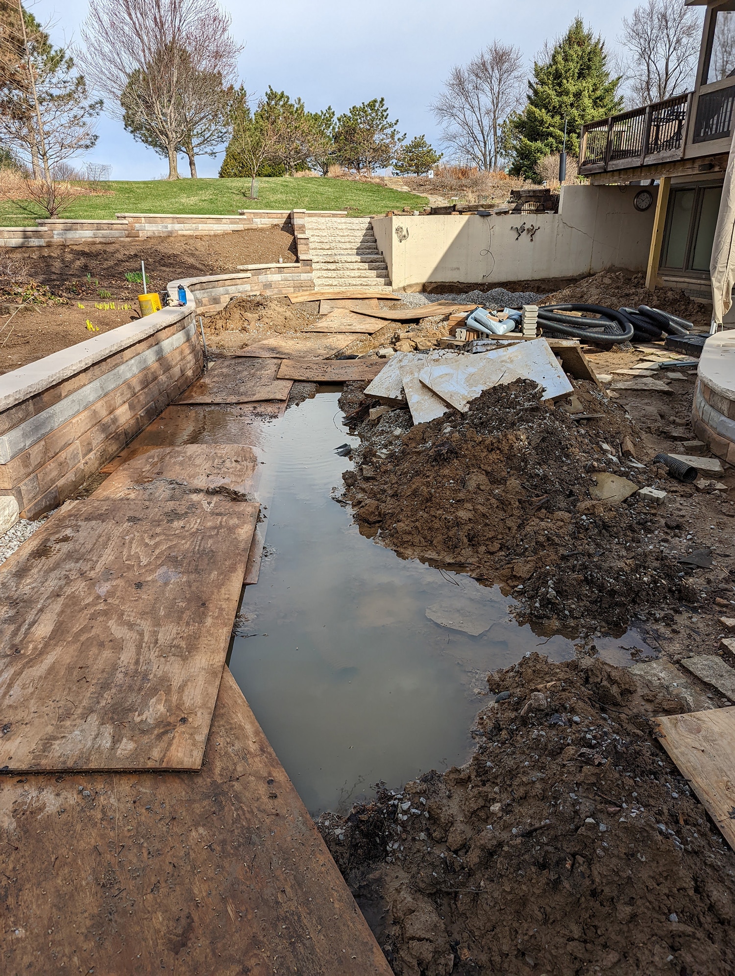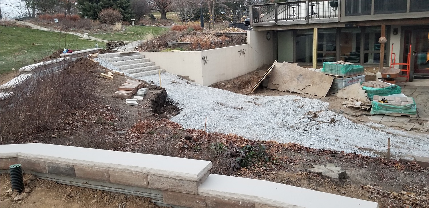 During the project, poor past work was discovered and resulted in some design modifications. The most notable poor workmanship occurred on a 6’ tall concrete retaining wall, where the footing was not at an appropriate depth and the wall was not backfilled appropriately. To solve the improper backfill of the existing concrete wall, a load reduction was achieved by removing solid clay (12 tons, by hand) and replacing it with gravel and new drainage pipes. The shallow footing was mitigated by adding and installing a stone grill station and bench seat in front of the wall to keep adequate weight on the footing.