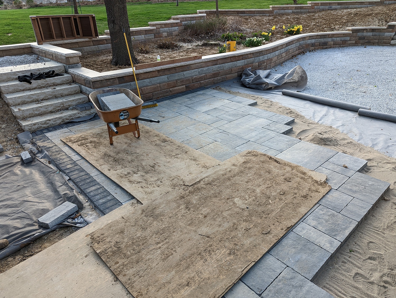 After draining the patio space, soil stabilization fabric was used to help provide a stabilized subbase for the patio, which sits upon fluid-like soils. The patio was constructed to properly drain towards the infiltration trench, which required the use of compound slopes to get the correct drainage patterns.