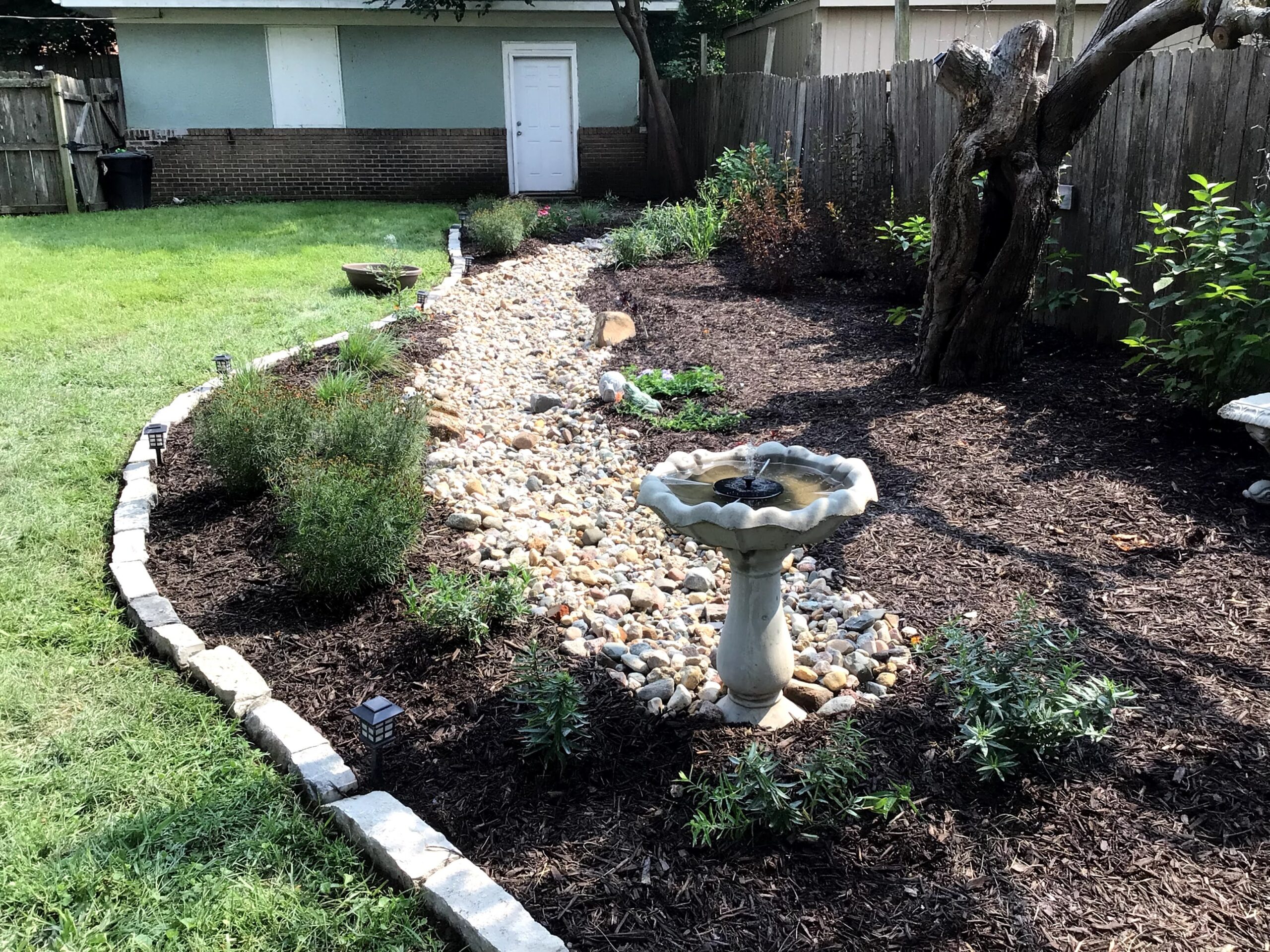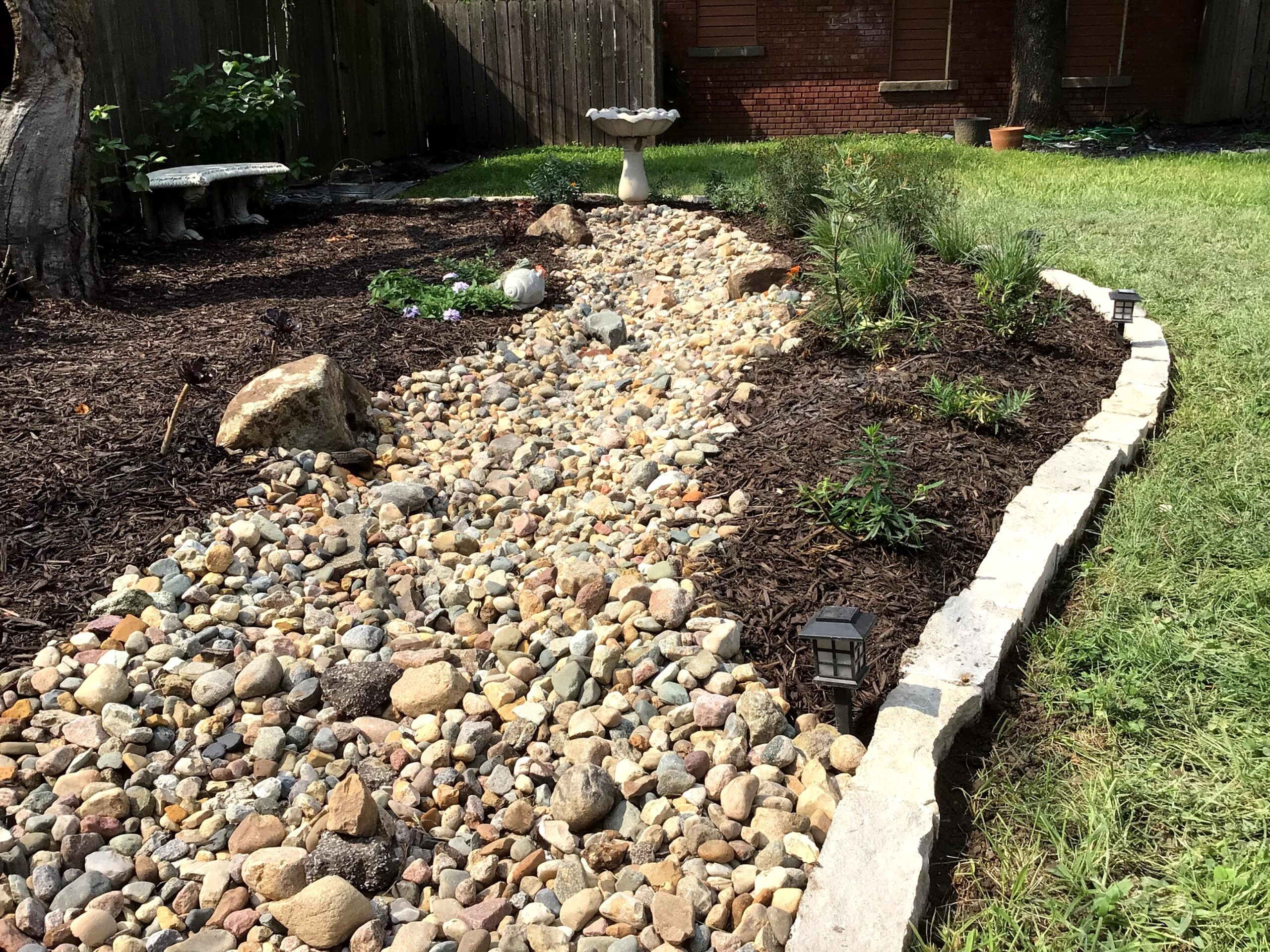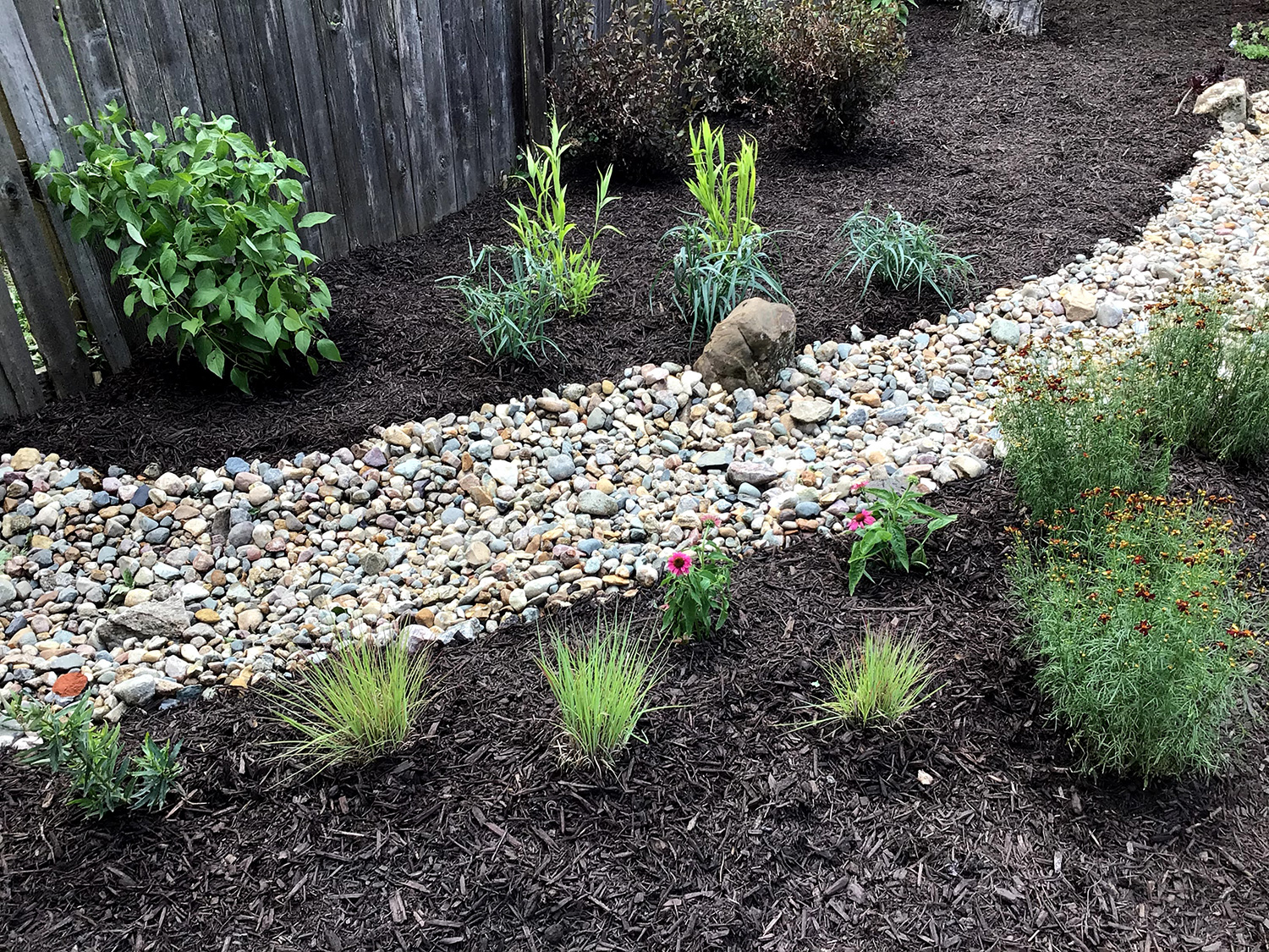 This homeowner had a yard that was barren and needing a makeover. The solution was a native, low maintenance garden with a dry creek bed to direct stormwater through the backyard. A combination of native shrubs, grasses and wildflowers were planted around the dry creek bed to create a pollinator garden that also provided color and interest year round. A new stone edge border helps delineate the new planting bed while making the garden pop, while the wood privacy fence helps to provide the perfect backdrop for the new garden.