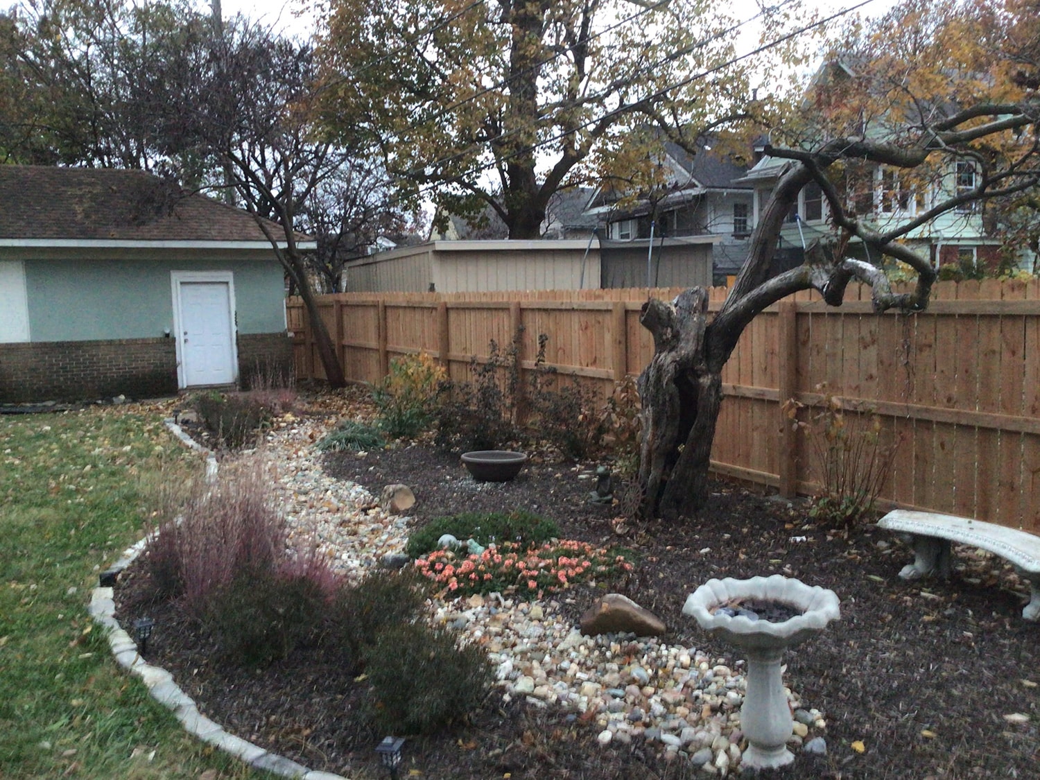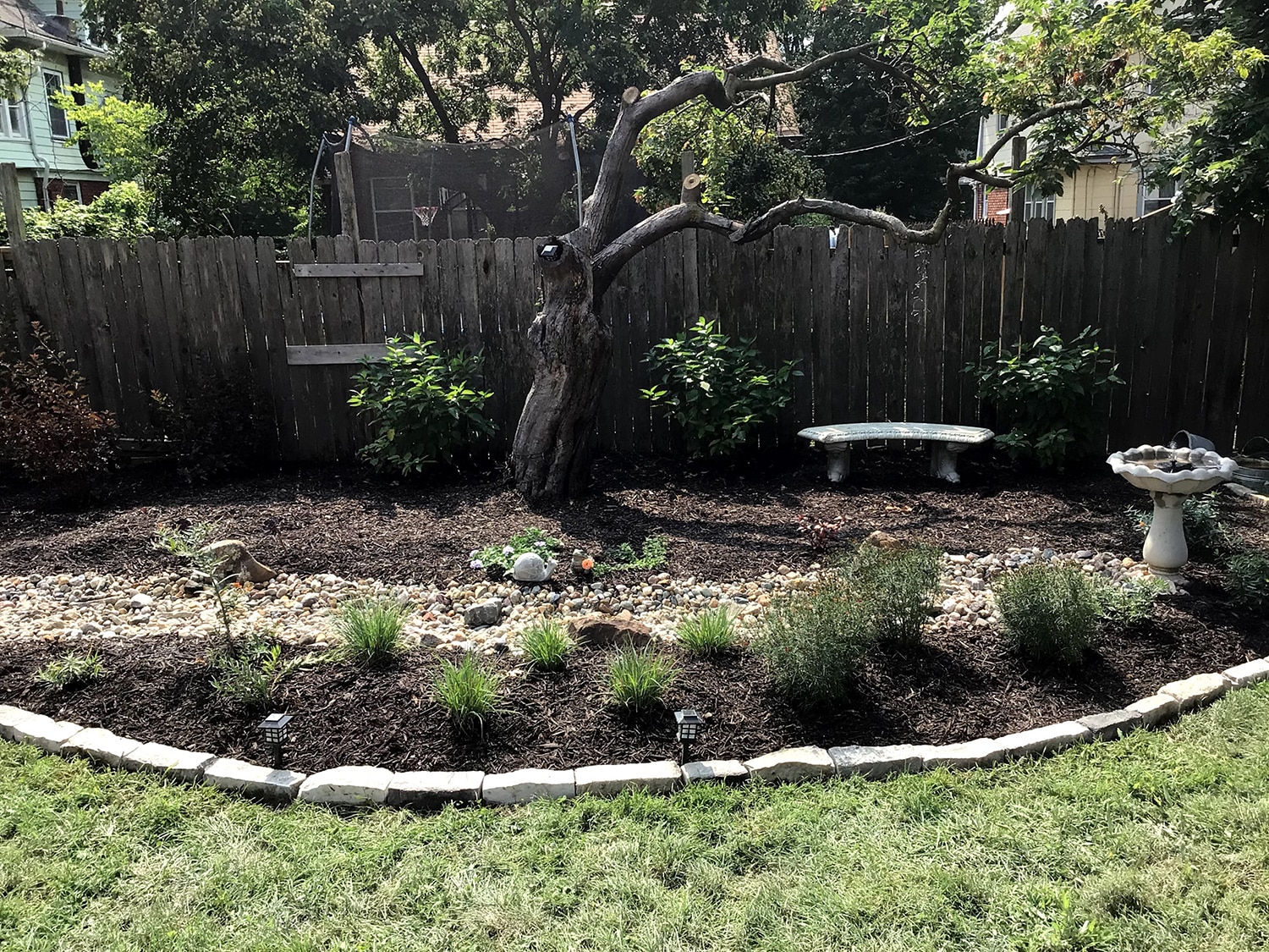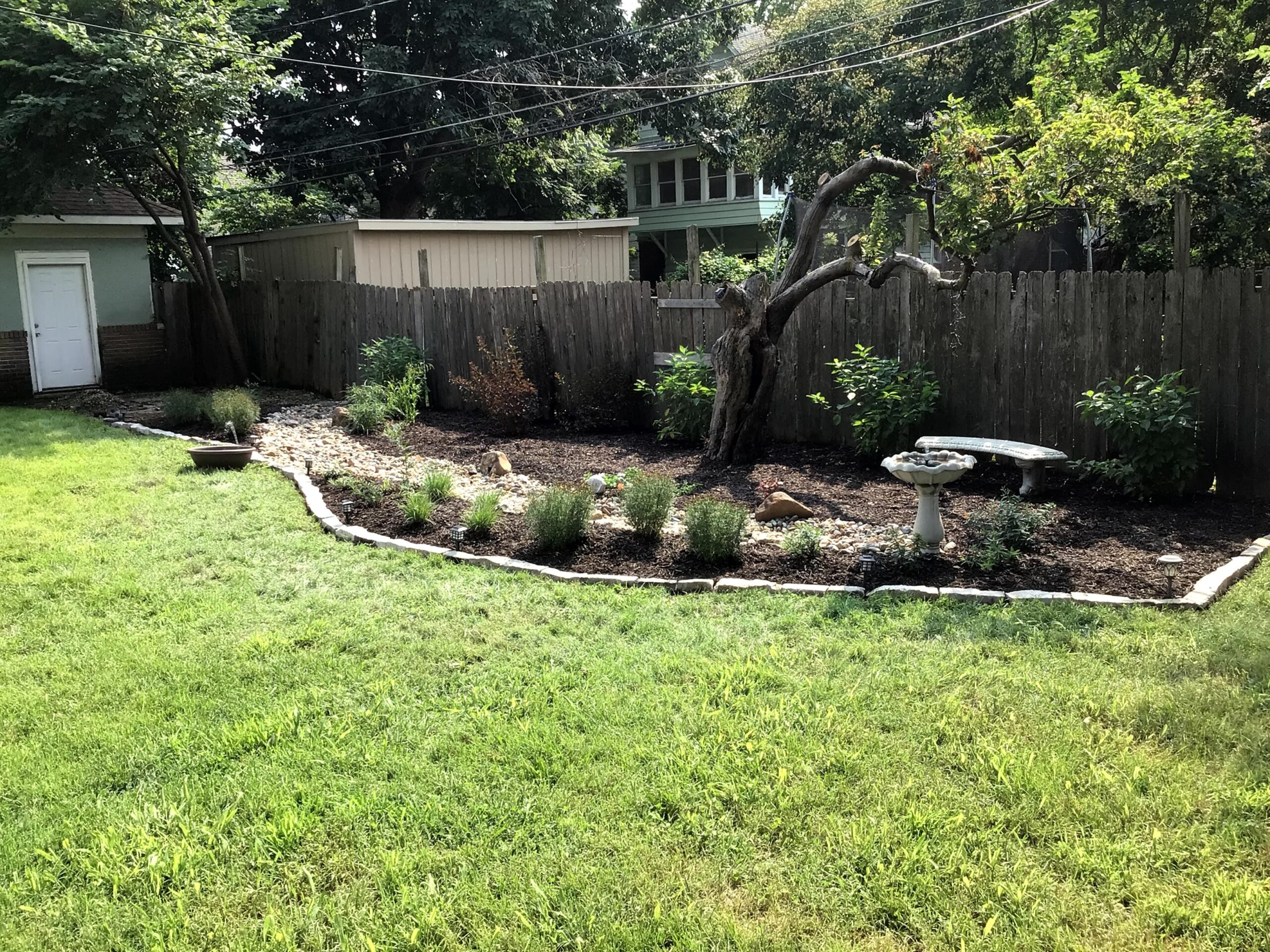This homeowner had a yard that was barren and needing a makeover. The solution was a native, low maintenance garden with a dry creek bed to direct stormwater through the backyard. A combination of native shrubs, grasses and wildflowers were planted around the dry creek bed to create a pollinator garden that also provided color and interest year round. A new stone edge border helps delineate the new planting bed while making the garden pop, while the wood privacy fence helps to provide the perfect backdrop for the new garden.